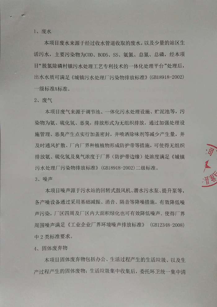本項目廢水來源于經過收水管道收取的廢水,以及少量的站區(qū)生活污水,主要污染物為COD、BOD5、SS、氨氮、總氮、總磷,經本項目“脫氮除磷村鎮(zhèn)污水處理工藝專利技術的一體化處理平臺”處理后,出水水質可滿足《城鎮(zhèn)污水處理廠污染物排放標準》(GB18918-2002)一級標準A標準。