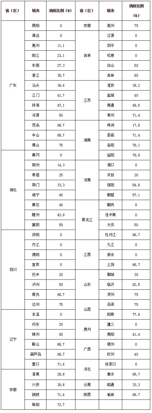 根據(jù)排查結(jié)果,全國共有77個(gè)城市黑臭水體消除比例低于80%,涉及廣東(13個(gè)城市,下同)、湖北(8個(gè))、四川(8個(gè))、遼寧(6個(gè))、安徽(5個(gè))、吉林(5個(gè))、江蘇(4個(gè))、湖南(4個(gè))、河南(4個(gè))、黑龍江(4個(gè))、江西(3個(gè))、山東(3個(gè))、山西(2個(gè))、貴州(2個(gè))、廣西(2個(gè))、河北(2個(gè))、云南(1個(gè))、陜西(1個(gè))。其中,四川省內(nèi)江、德陽、資陽、宜賓,吉林省遼源、四平、松原,廣東省揭陽、清遠(yuǎn),江西省九江、新余,黑龍江省鶴崗、佳木斯,湖北省黃岡,貴州省遵義,遼寧省本溪,廣西壯族自治區(qū)梧州,河北省張家口,河南省周口等19個(gè)城市消除比例為0。具體城市名單及消除比例見附表。
