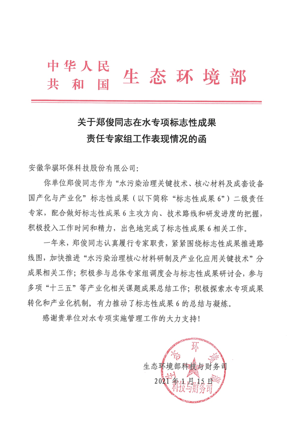 近日,國家生態(tài)環(huán)境部給安徽華騏環(huán)??萍脊煞萦邢薰景l(fā)來了感謝信,對華騏環(huán)保副董事長兼總工程師鄭俊先生作為“水污染治理關鍵技術、核心材料及成套設備國產(chǎn)化與產(chǎn)業(yè)化”標志性成果二級責任專家期間的出色工作表示肯定與感謝。